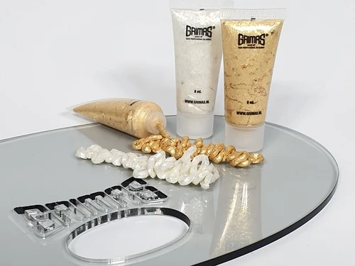 Grimas Shimmer Gel is een sterk glanzende glitter in een sneldrogende en gemakkelijk afwasbare geltextuur.