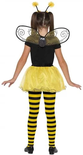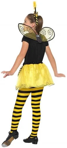 De set bestaat uit een hoofdband met twee antennes, een paar vleugels en een tutu. (T-shirt, panty en schoenen zijn NIET inbegrepen.) De taille van de tutu kan versteld worden en is versierd met een zwart strikje en blaadjes met strepen. Deze bijen set is zeer geschikt voor Carnaval maar zeker ook voor een verkleed feestje.