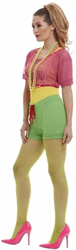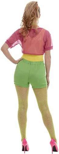 Bestaande uit een kort roze doorzichtige shirtje, gele top met tekst, groene shorts en roze hoofdband. Je maakt deze outfit compleet met een kleurige panty, beenwarmers en een van onze prachtige pruiken. Dit Jaren 80 kostuum is zeer geschikt voor o.a. Carnaval of een thema party.