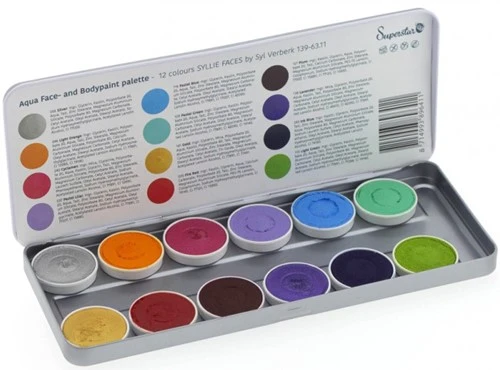 Superstar Schminkpallete Syllie Faces by Syl Verberk bevat 12 kleuren een zeer gebruiksvriendelijke waterschmink van hoge kwaliteit en voldoet aan alle strenge eisen van de Europese Cosmetica Wetgeving (1223/2009/EG).